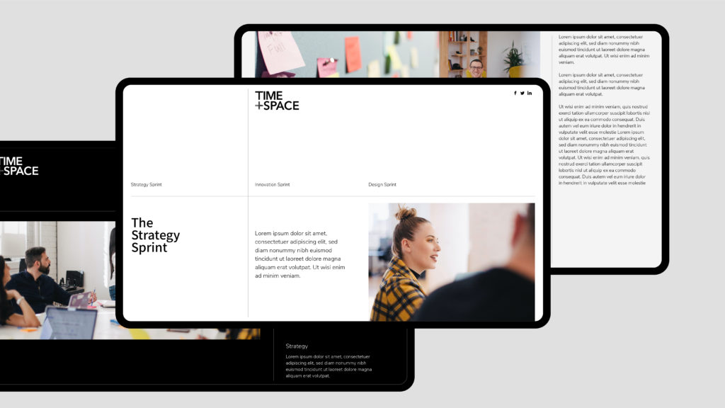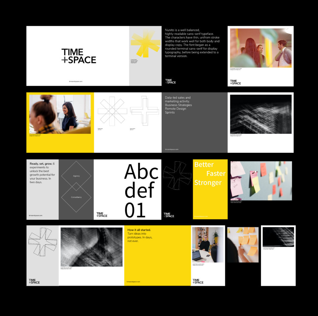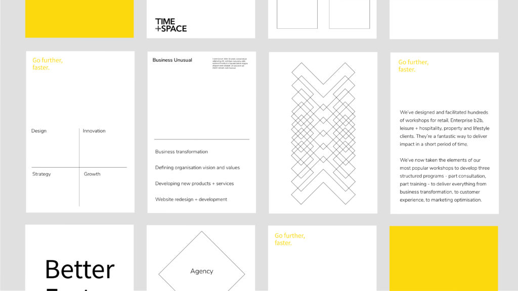 I have recently had the pleasure of designing the brand visual language for Time + Space studio. Time + Space use the sprint methodology to guide mission driven mid-sized businesses to build better strategies, products, innovation and growth, faster. The language was designed around the plus symbol – with the notion of ‘time’ being the horizontal line and ‘space’ being the vertical. The symbol is echoed in patterns that are representative of the brands services with an overall aspirational brand look that is suited for a fast growing and collaborative world.